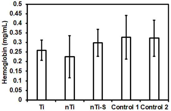The hemolytic activity of the different surfaces was assessed after incubation with erythrocytes using a commercially available hemolysis assay. Studies have shown that erythrocyte lysis can be induced due to contact with the implant surface due to its surface chemistry, surface charge, and topography [6]. The erythrocyte lysis induced by surface interactions leads to the release of hemoglobin [50,51]. Therefore, the presence of hemoglobin is a marker of hemolysis. The results (Figure 5) indicated that the hemoglobin release from the erythrocytes incubated with different surfaces was not significantly different from the two FDA-approved Buna N (control 1) and silicon elastomer (control 2). Hence, neither the micro–nano surface topography nor the silane chemistry induces hemolysis.