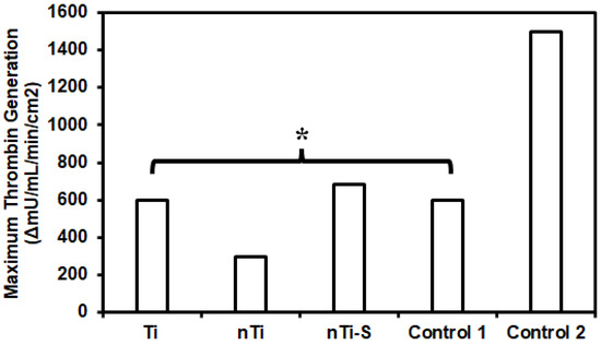 The thrombin formation of different surfaces was assessed using a commercially available thrombin generation assay. Studies have shown that thrombin plays a vital role in converting fibrinogen to fibrin, which is an integral step in clot formation. Thrombin is formed from prothrombin due to the coagulation cascade formation from the activation of both the intrinsic and extrinsic pathway [4]. Thrombin generation also activate platelets and inflammatory cell chemotaxis. Thrombin has a short half-life, making it complicated to quantify its activity [52]. The surface-exposed manufacturer-provided plasma was activated, and thrombin generation was measured at different time points. The assay is developed to measure the thrombin generation velocity at different time points and the highest velocity is reported. Standard deviation is applicable for this assay. The results (Figure 6) indicated that the rate at which thrombin was generated was significantly higher with medical steel compared to low-density polyethylene, titanium, and other modified surfaces over a period of 4 min. The nTi surface had the lowest thrombin generation velocity compared to Ti, nTi-S, low-density polyethylene (control 1), and medical steel (control 2) surfaces. This may be because the nTi surface is hydrophilic and there is constant thrombin generation.