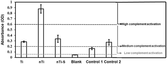 The complement convertase activation of different surfaces was assessed using a commercially available complement convertase assay. Thrombus formation is due to the initiation of the coagulation cascade, and this cascade is divided into two categories: the intrinsic and extrinsic pathway. The intrinsic pathway (contact activation) is because of the interaction between the adsorbed proteins and the implant surface. Complement activation is a part of the intrinsic inflammatory response and simultaneously influences blood clotting. Complement activation alleviates WBC adhesion and activation on the implant surface [53,54]. The different surfaces were incubated with manufacturer-provided plasma and the adhered complement factors on the surface were measured. The results (Figure 7) indicate that the nTi surface had significantly higher complement activation compared to the other modified, low-density polyethylene (control 1), and medical steel (control 2) surfaces. However, there was no significant difference between the medical steel, Ti, and nTi-S surfaces and the values were in the lower spectrum of medium complement activation.