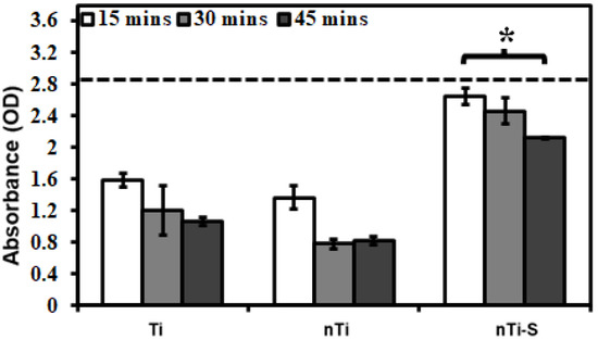 The blood clotting kinetics on the different surface was assessed after incubation with whole blood by quantifying the free hemoglobin in the blood interacting with the surface. Previous studies evaluated the influence of proteins, enzymes, and cells individually with the modified surfaces. However, when an implant is placed inside the human body, whole blood comes into contact with it. Hence, the whole blood clotting kinetics was studied. After 15 min, 30 min, and 45 min of incubation, the different surfaces were immersed in Milli-Q water to measure the hemoglobin on the live RBCs. RBCs, in the presence of Milli-Q water, rupture because of osmosis releasing the hemoglobin. Thus, a higher concentration of hemoglobin in Milli-Q water indirectly indicated less blood clotting at the surface. The results (Figure 8) indicated that after 45 min, the nTi-S surface had significantly higher hemoglobin compared to the Ti and nTi surfaces, thus evidently preventing blood clotting significantly. Similar trends were observed over the entire duration of the study. Over time, there was a steady decrease in free hemoglobin; a part of this is due to the exposure of blood to the atmosphere.
