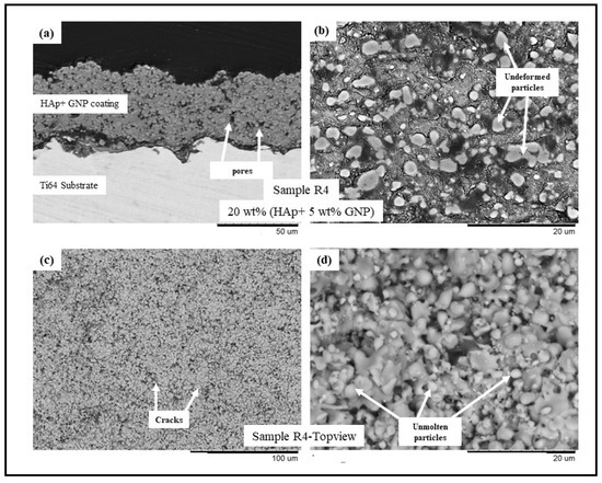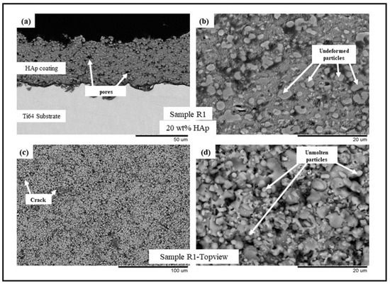 The backscattered electron (BSE) scanning electron microscopy (SEM) images of samples R1-R4 (see Table 2) are presented in Figure 1, Figure 2, Figure 3 and Figure 4, respectively. All the coatings exhibited a similar coating profile at the interface between the coating and the substrate. Since the deposition parameters are similar, there is no significant variation in the microstructure among the coatings deposited. It is observed that all the coatings are characterized by the presence of undeformed and unmolten/re-solidified particles along with the splats resulting from the impact of the molten particles. The microcracks and pores in the coating system are also evident from the surface morphologies and coating cross-sections, respectively, in each case. Overall, the cross-sectional microstructure of the coatings revealed a refined microstructure along with micro-pores and spherical undeformed particles. Although there are many undeformed particles in the coatings, the particles are well fused to each other. This good cohesion shall be attributed to the bimodal size distribution of the HAp powder used in this study, with the well-molten small particles acting as a binder between the big unmolten particles.
