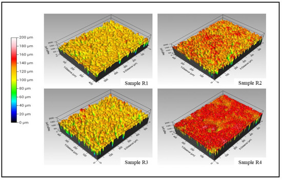 3D white light interferometry images of samples R1 (HAp), R2, R3 (HAp + 2 wt.%GNP), and R4 (HAp + 5 wt.%GNP), respectively.