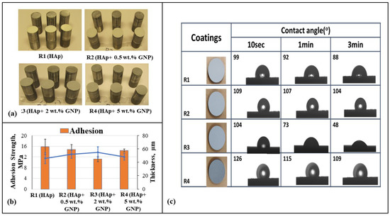 (a) Three adhesion test samples per sample type, i.e., R1 (Hap), R2 (Hap + 0.5 wt.%GNP), R3 (Hap + 2 wt.%GNP), and R4 (HAp + 5 wt.%GNP), respectively. (b) Adhesion strength and thickness plot against samples R1, R2, R3, and R4, respectively. (c) Contact angle measurements with water drop on axial suspension plasma sprayed R1 (HAp), R2 (HAp + 0.5 wt.%GNP), R3 (HAp + 2 wt.%GNP), and R4 (HAp + 5 wt.%GNP) samples after 10 s, 1 min, and 3 min.