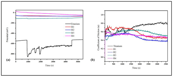 (a) Open circuit potential and (b) comparison of the friction coefficient of titanium, R1 (Hap), R2 (Hap + 0.5 wt.%GNP), R3 (Hap + 2 wt.%GNP), and R4 (HAp + 5 wt.%GNP).