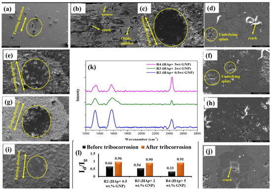 The worn scar morphology of (a,b) Ti-6Al-4V alloy and the coatings (c,d) forR1 (HAp), (e,f) for R2 (HAp + 0.5wt.%GNP), (g,h) for R3 (Hap + 2 wt.%GNP), and (i,j) for R4 (HAp + 5 wt.%GNP), after the tribocorrosion test. Graphene retention as assessed by Raman analysis. (k) An Id/Ig ratio (l) at the site of wear scar post fretting tribocorrosion.