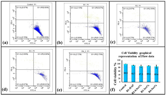 Assessment of cytotoxicity PI staining assay: The viability gate separates the live cells (Blue) from dead cells (grey) in quadrant 4. For (a) Control Cells (b) R1 (c) R2 (d) R3 (eR4 (e) raphical representation of Flow Cytometry data. Representative (n = 4) flow cytometric confirmation of cell viability. (f) Graphical representation of cell viability.