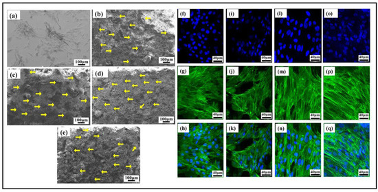 SEM images of hMSCs seeded on samples. The hMSCs cultured on the substrates adhered to plastic control (a) and the surface of sample R1 (HAp) (b), R2 (HAp + 0.5 wt.%GNP) (c), R3 (HAp + 2 wt.%GNP) (d), and R4 (HAp + 5 wt.%GNP) (e). Yellow arrows indicate cells. Confocal images of hMSCs cultured on samples. Nuclear and F-actin staining of hMSCs using DAPI in blue color and Phalloidin in green color for cells seeded on R1 (HAp) (f–h), R2 (HAp + 0.5 wt.%GNP) (i–k), R3 (HAp + 2 wt.%GNP) (l–n), and R4 (HAp + 5 wt.%GNP) (o–q).