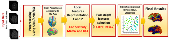 Illustration of the full steps of the adopted framework, including preprocessing, brain parcellation, feature representation, feature selection, and machine learning (ML) classification.
