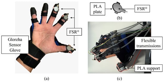 Three FSR® were embedded in the fingertips of the thumb, index finger, and middle finger of the exoskeletal glove, in order to limit the complexity of the prototype. As also highlighted in research studies that investigated force synergies [,], they are the fingers mostly involved in daily grasping actions. The sensor was positioned on the curved surface of the fingertip (Figure 2a). In order to uniformly distribute the force on the sensitive area of the sensor, the interface between the Gloreha sensor glove’s fingertips and the sensors was modified by inserting a thin 3D printed PLA plate ( m thickness and m diameter), fixed to the sensor by means of double-sided tape (Figure 2b). Moreover, a PLA support was also printed in 3D and fixed to the connections of the flexible transmissions (see Figure 2c). The thin PLA plate also allows securing the sensors on the fingertips by means of an elastic band that can be fastened at the top of the custom-designed PLA support (Figure 2c).