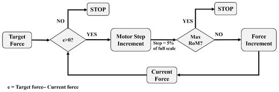 Block scheme of the strategy implemented for the active-assisted training. Every 3 s, the current force is compared with the target force. If the current force is lower than the target one, the position of the motor is updated by providing 5% of the full-scale position increment to generate additional grasping force. Moreover, the RoMs of the fingers are also evaluated every 3 s: if the RoM of one of the fingers exceeds the maximum RoM recorded in the calibration phase, the exercise ends.
