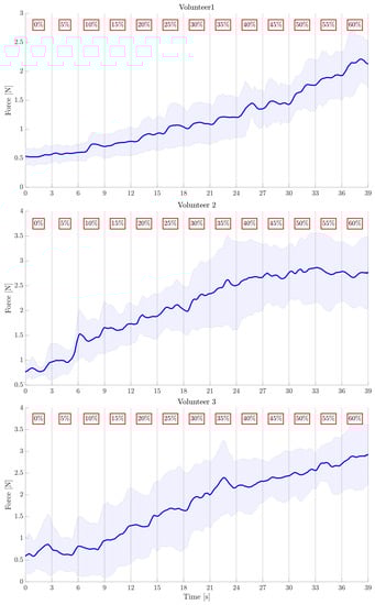 Figure 6 shows the increasing trend of the average force exerted on the three fingers by the motors, together with the motor step, for each volunteer. In particular, the blue line represents the mean of the average force in the six trials, and the shaded area represents the standard deviation.
