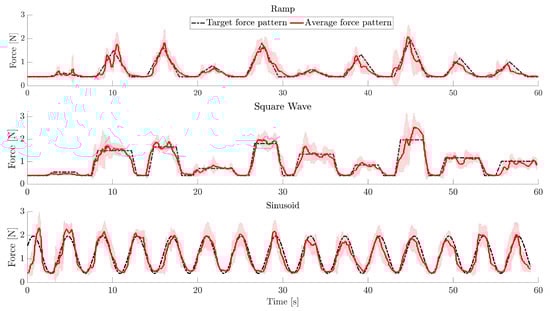 Average force pattern (red line) ± standard deviation (shaded area) and target force pattern (black dotted line) for the “Ramp”, “Square Wave”, and “Sinusoid”, level 1, for one representative volunteer who obtained average performances among the enrolled volunteers. The average force and standard deviation were computed for the 4 repetitions of level 1 for each exercise.