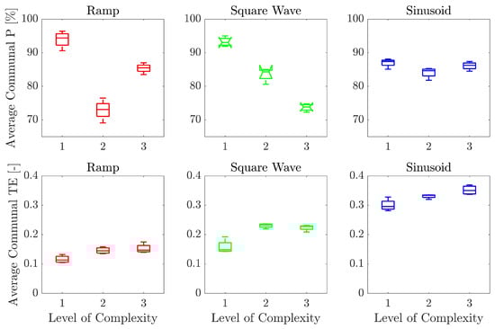 Figure 8 shows the average communal P and average communal TE scores obtained by the 10 volunteers in each one-minute repetition at each of the three levels of complexity, for the three proposed waveforms. For the C/average communal P pair, the Kruskal–Wallis test returned p-values of , , and for the “Ramp”, “Square Wave”, and “Sinusoid”, respectively, whereas for the C/average communal TE pair, the test returned p-values of , , and for the “Ramp”, “Square Wave”, and “Sinusoid”, respectively.