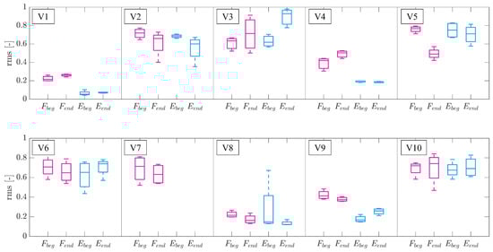 Root mean-square level (rms) of EMG signals for each volunteer (V). and are the indices computed on flexor digitorum superficialis (in magenta), and and were computed on extensor digitorum communis (in light blue), at the beginning and the end of the trial, respectively. The middle line is the median of four trials in the same experimental conditions, the edges of the box are the 25th and 75th percentiles, and the whiskers extend to the most extreme data points not considered outliers.