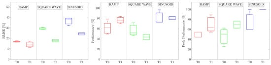 Figure 10 shows the normalized RMSE, the P, and the PP obtained for each of the three waveforms, before and after the therapy (T0 and T1, respectively). The three waveforms are highlighted with different colors.