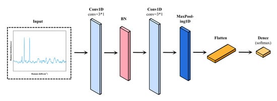 CNN is a crucial component of deep learning algorithms, with features such as local connectivity and weight sharing which can effectively solve the problems of many parameters and the easy overfitting of traditional neural networks. Natural language processing and image categorization are two areas where it has seen extensive usage [29]. We constructed a one-dimensional CNN model to categorize Raman spectra. Figure 2 shows the structure of our CNN model. The Raman spectral data input to the model is the one-dimensional vector of length 1698. The hidden layer contains a convolutional layer, a batch normalization layer and a pooling layer. We use two convolutional layers and one pooling layer to extract Raman spectral characteristics. The first convolution layer contains 8 output channels, and 8 feature mappings are extracted from the Raman spectral data using a convolution kernel of length 3. The number of channels in the second convolution layer is doubled to 16, and more feature mappings are extracted from the previous output data. The shared convolution kernel can effectively reduce computational complexity and keep the classifier stable during the spatial transformation [30]. Following the second convolutional layer is a max-pooling layer with a pool size of 1 × 3. The pooling layer can perform feature compression to extract the main features and can also avoid overfitting to a certain extent. We also added a batch normalization layer between the convolutional layers, a development which can speed up the network training and prevent the overfitting of the model. After that, these extracted features were input into the fully connected layer and the output layer with the number of nodes at 9024 and 3, respectively, which could be viewed as a classifier. The output function was softmax, which could calculate the probability of each sample belonging to each category separately and use the category with the highest probability as the category of the sample for classification. During the training of the CNN model, we used cross-entropy loss combined with gradient descent to continuously update the CNN’s weights and biases, and optimized the model hyperparameters by a 5-fold cross-validation of the training set. Finally, an unknown test set was fed into the trained model to evaluate the classification performance.