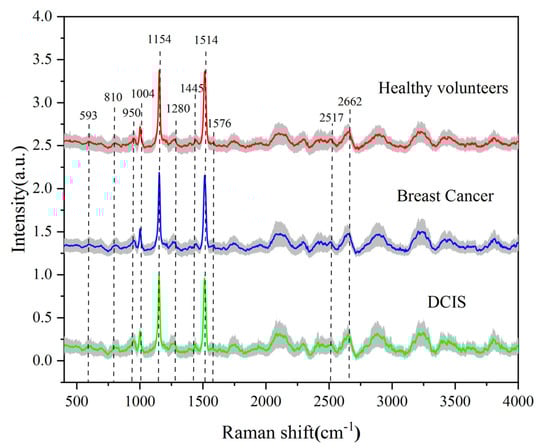 Comparison of normalized mean Raman spectra of serum sample for three groups: (1) Healthy volunteers (n = 241), (2) Breast cancer patients (n = 463) and (3) DCIS patients (n = 100). The shaded area is the standard deviation of the spectra.