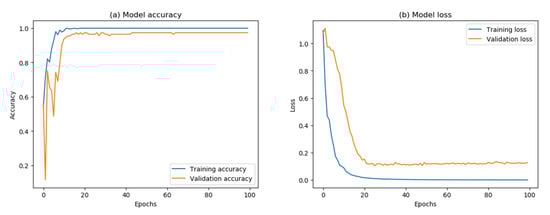 (a) Accuracy curves of training set and validation set. (b) Loss curves of training set and validation set.