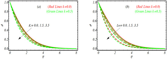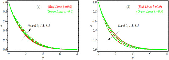 The effects of vortex viscosity factor variable thermal conductivity parameter thermophoresis constant modified Dufour number , Prandtl number and viscoelastic parameter on temperature profile are visualized by plotting Figure 2a–f. Here, it is remarked that the physical observations for each parameter have been examined for viscoelastic behavior and without the viscoelastic parameter i.e., . First, the variation of is listed in Figure 2a. The temperature profile decreases by increasing In Figure 2b, we conclude that the temperature of nanoparticles for both and declines by varying This declining trend is relatively dominant for the viscoelastic case as compared to . Physically, smaller physical attribution of thermal diffusivity for increasing is noticed, which depressed the temperature. The response of variable thermal conductivity on is reported in Figure 2c. Following the graphical trend, it is concluded that variable thermal conductivity is more useful to enhance the temperature profile. Further, in contrast to the increasing trend seems to be dominant for . From Figure 2d, gradually increases when Nt is enlarged, that is, due to thermophoresis, the tiny fluid particles shift to the relatively cold region, with a resulting enhancement of temperature. Moreover, the thermal boundary layer is thicker for than . The output of for modified Dufour number is reported in Figure 2e. The variation of leads to improving the temperature profile and enlarge the thickness of boundary layer. The observations for against various values of are provided in Figure 2f. The reflection of viscoelastic factor reduced thermal flow due to presence of viscosity for both and .