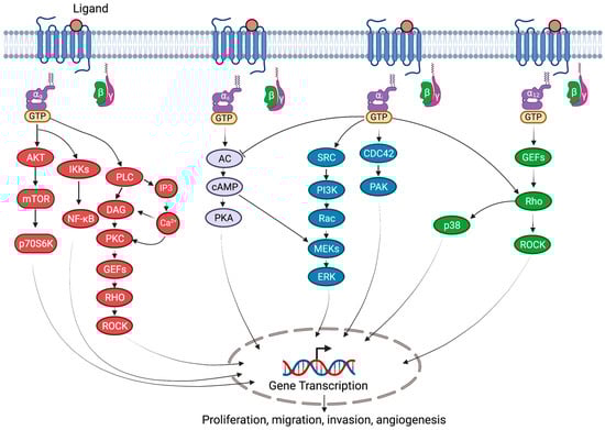 G-proteins are a family of specialized proteins that can bind to nucleotides, i.e., guanosine triphosphate (GTP) and guanosine diphosphate (GDP); thus, they are also known as guanine nucleotide-binding proteins [11]. G-proteins are either composed of a single subunit (monomeric) or multiple subunits (heterotrimeric). For example, Ras proteins are monomeric, and G-proteins associated with G-protein-coupled receptors (GPCRs) are heterotrimeric. The monomeric structures, known as small G-proteins/GTPases, consist of an alpha subunit only (Gα), while the heterotrimeric subunit has three different subunits: an alpha (α), a beta (β), and a gamma (γ) subunit. The β and γ subunits form a stable dimeric complex called the βγ complex (Gβγ). The βγ complex is considered a single functional unit and is attached to the plasma membrane by lipid anchors. Humans have 16 Gα, 5 Gβ, and 13 Gγ subunits. Different combinations of these subunits result in a wide range of heterotrimeric G-proteins [12].