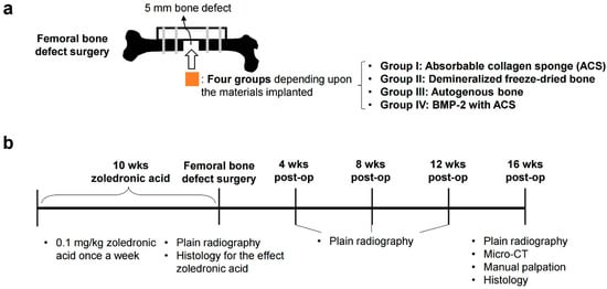 A schematic diagram of study design. (a) The schematic figure of femoral bone defect surgery. Each animal was performed with a 5 mm femoral bone defect, stabilized by a polyethylene plate with K-wire. The defects were implanted with an absorbable collagen sponge (group I), with demineralized freeze-dried bone (group II), with autogenous bone (group III), or with BMP-2 with an absorbable collagen sponge (group IV). (b) The study’s timeline indicates the time points for injection of zoledronic acid, femoral bone defect surgery, radiology, histology, micro-CT, and manual palpation.