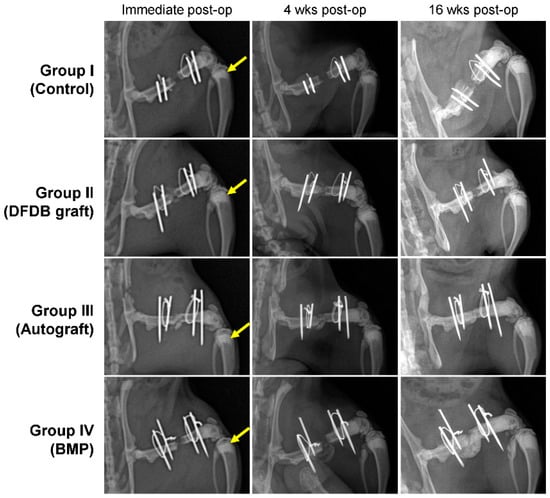Radiographic findings at postoperative four and 16 weeks in each group. Groups I (Control) and II (DFDB graft) showed nonunion, while groups III (Autograft) and IV (BMP) showed unions in the femoral defects.