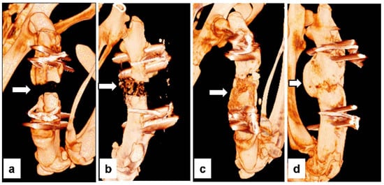The three-dimensional (3D) reconstruction images are shown in Figure 4. The results of the micro-CT analysis for bone volume are shown in Table 3. The mean bone volumes in groups I, II, III, and IV were 42.8 ± 19.8 mm³, 72.93 ± 15.6 mm³, 168.78 ± 20.1 mm³, and 193.94 ± 61.5 mm³, respectively. The mean bone volumes of groups III and IV were significantly (p < 0.05) larger than those of groups I and II. However, there was no significant (p > 0.05) difference in bone volume between groups III and IV. The mean bone volume per tissue volume (BV/TV) percentage in the I, II, III, and IV groups was 15.79 ± 5.6%, 36.44 ± 2.5%, 64.3 ± 1.4%, and 56.59 ± 9.8%, respectively. The mean BV/TV of groups III and IV was significantly higher than that of groups I and II. In contrast to the bone volume pattern, the mean BV/TV value in group III was increased compared to that in group IV, but the increase was not significant. These results suggested that the autobone grafts had a small amount of callus, but the remodeling potential was faster than that of BMP. In addition, these results suggest that bone formation has occurred beyond the bone defect site where the femur was initially located (heterotopic ossification, Figure 4d) [21].