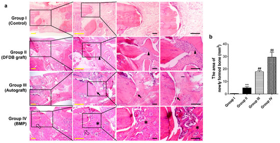Histologic findings of the bone defect sites in the various experimental groups. (a) The bone defect site was filled with fibrous tissue without bone formation in the absorbable collagen sponge alone group. The defect site in the demineralized freeze-dried bone (DFDB) graft group was filled with fragmented lamellar bone (the arrowhead indicates the grafted bone) and fibrous tissue. The defect site in the autograft group was also filled with lamellar bone. However, the lamellar bone in the defect site with an autograft was thicker and more abundant, with relatively less fibrous tissue compared to the DFDB graft group. However, the junction between the cortical bone and newly formed bone from the autograft was partially discontinuous (arrows). In contrast, the defect site in the BMP-treated group was filled with newly formed bone (asterisks), and the junction between the cortical bone and new bone was continuous (empty arrows). Yellow bars = 1 mm, Black bars = 200 μm. (b) The measurement of the area of newly formed bone from staining images of tissue sections (n = 10), and the values are means ± SEM. and the values are means ± SEM. ** p < 0.01 versus group I, ## p < 0.01 versus group II, $$ p < 0.01 versus group III.