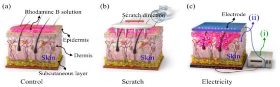 For the mass-diffusion analysis, a rhodamine B solution was used. A needle cartridge was employed to puncture microholes in the skin (Figure 1b). The arrows in the figure indicate the direction of the ensuing scratch. The drug was expected to diffuse through the perforations and scratches. Moreover, when an electric field was applied, the drug was delivered transdermally due to ionic repulsion that arose between the drug and the electrode (Figure 1c).