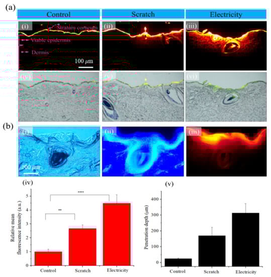 (a) Fluorescence and merged optical images. (i,iv) Control, (ii,v) scratch effects, and (iii,vi) electricity effects. (b) Magnified images obtained when electricity was applied. (i) Bright field image, (ii) 4′6′-diamidino-2-phenylindole staining image, (iii) fluorescence image, (iv) fluorescence distribution using Image J (here, ** indicates p < 0.05 and **** indicates p < 0.01), and (v) penetration depth (the scale bars in (a-i)–(a-vi) = 100 μm and in (b-i)–(b-iii) = 100 μm).