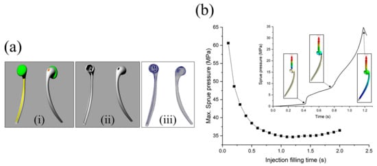 Thus, the v–p switch value was set to 98% because the machine required a buffer to prevent damage. Figure 5a depicts the melt front advancement in the cavity with the exception of the runner part with respect to time. As shown in Figure 5(a-i), the time required to fill 25% of the total volume was 0.627 s, which accounted for approximately 50% of the total filling time (1.226 s). This could be attributed to the complex topology of the upper part of the product’s structure and the low initial sprue pressure. Over time, the resin flowed to the bar part of the product with a simpler shape, and the sprue pressure dramatically increased. Therefore, the time for 75% volume filling was 1.026 s (Figure 5(a-ii)), which is approximately 84% of the total filling time.