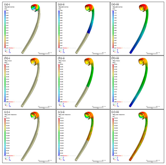 (a) Melt front of polymer in the mold cavity with respect to time: (a-i) 25%, (a-ii) 75%, and (a-iii) 100% filling. (b) Pressure distribution in the mold cavity with respect to time: (b-i) 25%, (b-ii) 75%, and (b-iii) 100% filling. (c) Center temperature distribution in the mold cavity with respect to time: (c-i) 25%, (c-ii) 75%, and (c-iii) 100% filling.