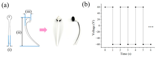 Recently, the demand for innovative medical devices based on bioelectronics for enhanced performance and cost-effectiveness has increased [1,2,3]. In particular, transdermal drug delivery systems have received considerable attention [4,5,6,7]. To increase the driving force for drug delivery, several physical stimuli, such as chemical enhancers, microneedles, and electric currents, have been applied [8,9,10,11,12,13,14,15,16,17,18,19,20,21,22,23,24,25,26]. For instance, the iontophoresis process induced by an electric current repels ions and induces an electric field [14,15,16]. Iontophoretic delivery generally improves penetration deep into the stratum corneum, the outer skin layer [17,18,19]. That is to say, the electric current increases the drug permeability of the skin, which is required for effective drug delivery. In general, the direct current (DC) or alternating current (AC) power sources and metallic electrodes for iontophoresis devices are relatively heavy, bulky, and expensive [27,28,29]. These factors limit the usage of such devices in daily life. Therefore, the size, weight, and cost must be reduced for commercialization of these devices.
