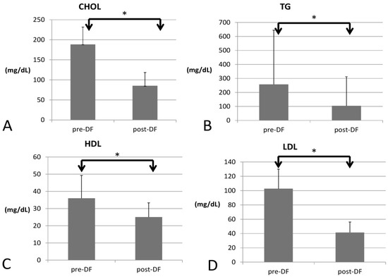 Changes in the lipid profile, including (A) total cholesterol (CHOL), (B) triglycerides (TG), (C) high-density lipoprotein (HDL), and (D) low-density lipoprotein (LDL) before and after DF (all showed significant decrease). (* for p < 0.05).