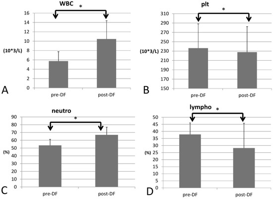 Changes in complete blood count (CBC) with increase of WBC (A) and decrease of platelet (B) and differential count (DC) with increase of neutrophil (C) and decrease of lymphocyte (D) before and after DF. (* for p < 0.05).