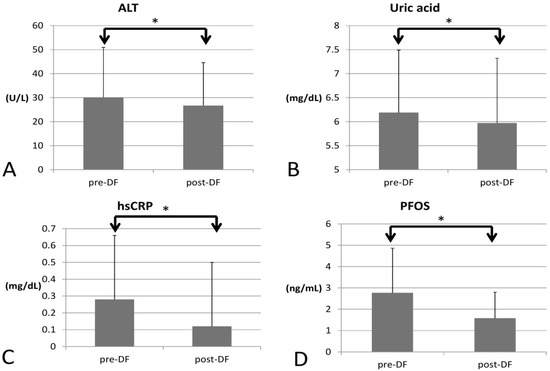 Changes in inflammatory marker, PFOS, uric acid, and liver function before and after DF (all showed significant decrease). (A) alanine transaminase (ALT), (B) Uric acid (C) hsCRP (D) perfluorooctane sulfonate (PFOS). (* for p < 0.05).