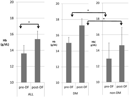 Table 3 compares patients with and without DM. DM patients were heavier in body weight and had higher hemoglobin (Figure 4), hematocrit, serum glucose, HbA1c, insulin, ALT, and triglycerides, but significantly lower HDL and LDL compared with nondiabetic patients. A similar pattern was found after DF except for TG and T chol/HDL.