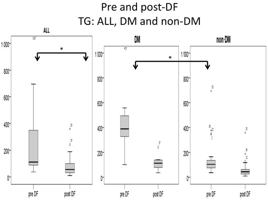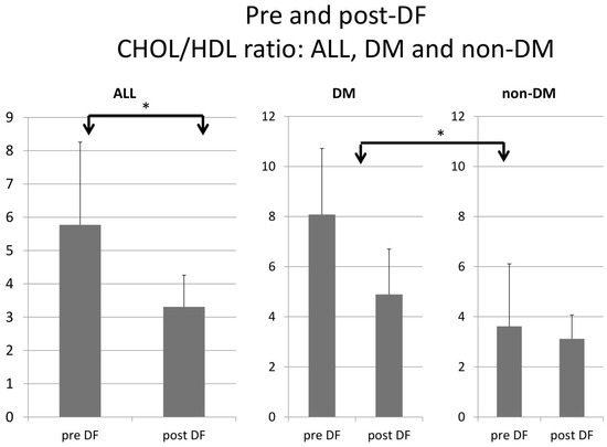 Higher TG and total cholesterol/HDL ratio were noted in the DM group before DF, but the difference became insignificant after DF (Figure 5 and Figure 6).