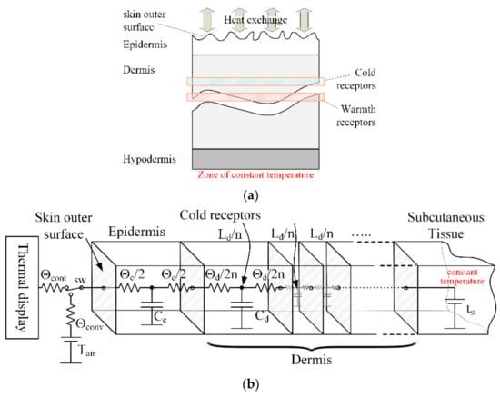 The physical process that occurs in our skin in response to a thermal stimulus is conductive heat transfer. The process initiates with a heat exchange on the skin surface that leads to heat flow through the skin tissue. A thermal stimulus can be applied to the skin either by contact with an external object of a different temperature or, in a scenario more relevant to the current research, when the thermal equilibrium at an ongoing skin–object interface is disrupted by a change in temperature imposed on the object. In both cases, the heat transfer starts with a heat exchange between the skin and the object due to the temperature difference and progresses in-depth to the tissue. The heat flow intensity is determined by the thermal properties of the skin, the thermal display, and the interface. The heat within the tissue is distributed in accordance with the boundary conditions—the thermal stimulation on one end and the regulated body temperature on the other.