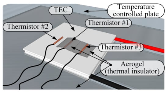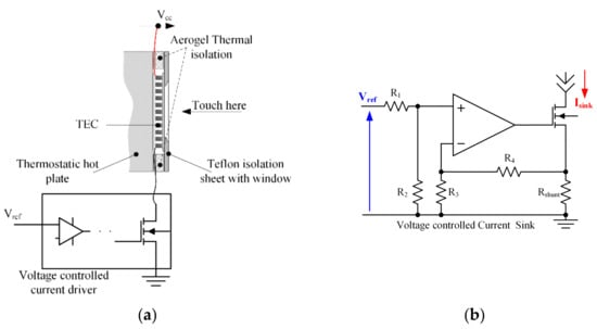 A thermoelectric cooler (TEC) is a solid-state heat pump that employs the Peltier effect. TECs pump heat from one surface to another using electrical power. The heat flux coming into or out of the TEC surfaces is proportional to the electrical current applied, times the temperature of the surface in Kelvin. Since the variations in the thermal display’s absolute temperature are relatively small, the heat flux is almost proportional to the electrical current driving the TEC. To be more precise, the TEC full heat equation includes two terms that represent the energy waste due to the resistance of the TEC material itself, one thermal resistance and the other electrical resistance. However, the equation defines the steady state achieved with time, and at the initial stage of dynamic stimulation, these terms are negligible. The heat flow direction is in accordance with the direction of the electrical current.