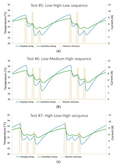 A TEC is an excellent candidate to serve as a thermal display in experimental research. One side of the TEC is maintained at a predetermined, stabilized temperature, causing the positive or negative temperature difference forced by the input current to impact the other side, hence creating the desired thermal stimulus. The approach considered in this study is to control the electric current driving the TEC rather than directly controlling the thermal stimuli. In practice, the correlation between the electric current and the thermal cue displayed is not perfect due to a physical limitation we show during the experiments: although the TEC backside temperature is stabilized, the control circuit cannot react fast enough to thermal pulses, and a pulse-like change in its temperature is observed, thereby decreasing the desired temperature change on the front surface serving as the thermal display. However, this seems to be a consistent and predictable phenomenon with only a quantitative impact. Hence, the correlation is assumed to be acceptable for this study, which is focused on evaluating the concept of pulse-based patterns, particularly due to the understanding that recognizability is based on the relativity of the thermal sensation comparing adjacent pulses.