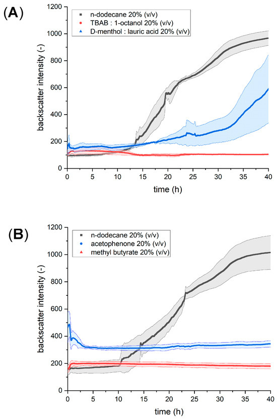 As described above, various solvents were tested and their suitability as alternatives to n-dodecane was investigated. In the first step, the influence on the growth of C. necator was investigated. The heterotrophic growth of C. necator pKR-hum in a minimal medium was reduced by the addition of the deep eutectic solvents compared to n-dodecane (Figure 1A). The addition of 20% (v/v) of 1:2 molar TBAB:1-octanol resulted in no growth after inoculation. The addition of 20% (v/v) of the 2:1 molar D-menthol:lauric acid mixture resulted in reduced growth with a prolonged lag phase up to 20 h and a reduced final cell concentration of 300–800 backscatter intensity after 40 h compared to 900–1050 backscatter intensity with n-dodecane. Nevertheless, successful separation and formation of a second phase above the minimal medium was observed for both deep eutectic solvents identical to n-dodecane.