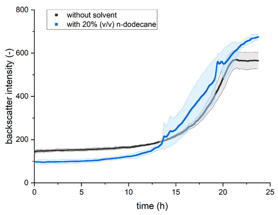 The heterotrophic growth behavior in Figure 2 shows a similar pattern between the bacterial growth without solvent and the addition of 20% (v/v) n-dodecane, considering the standard deviation. In both experiments, the length of the lag phase is about 10 h and the cultures in exponential phases behave similarly. The experiment with 20% (v/v) n-dodecane reaches an increased final backscatter value at 25 h. However, this increased backscatter intensity value can be attributed to the additional n-dodecane, since an offline optical density measurement at 600 nm for both experiments showed a value of 3.0 and 3.1, respectively, at the end of the cultivation. Therefore, the slightly increased backscatter value can be explained by the addition of phase-forming solvents in general.