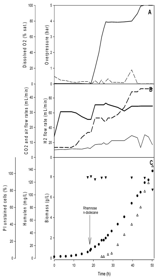 Autotrophic α-humulene production was investigated in a dedicated gas bioreactor, as described in [41] and using the above-mentioned C. necator strain [12]. The cultivation was initiated by sparging the three independent gases (H2, air and CO2) in the reactor. The initial condition was set at 77% H2, 4% O2 and 5% CO2 gas mixture in the reactor, allowing a H2-rich and O2-low environment to be reached. The level of dissolved oxygen was monitored throughout the cultivation by increasing the ratio of air/H2 flow rate and the overpressure in the gas bioreactor in order to react to the increasing microbial oxygen demand and to keep the headspace O2 level below 5% (Figure 3). During the cultivation process, the gas flow rates ranged from 30 to 70 mL min−1 for H2, 6.7 to 45 mL min−1 for air and 2 to 8 mL min−1 for CO2. The α-humulene production strain C. necator (pKR-hum) was grown in the bioreactor for 50 h, the highest specific growth rates were obtained during the ten hours before induction at 18 h with µ = 0.13 ± 0.01 h−1. Two hours after induction, the growth rate decreased. Besides the heterologous gene expression, which reduced the specific growth rate after induction, limitations in oxygen transfer occurred and limited the process performance. The dissolved oxygen concentration was adjusted to between 1 and 3%, but starting from 42 h after inoculation the value was constantly zero. The portion of the oxygen in the inlet gas flow could not be further increased because the lower explosion limit was reached (exhaust gas with 4% oxygen in a hydrogen-dominant gas composition). Furthermore, the reactor pressure limit of six bars was reached and the total gas flow was already high with 120 mL min−1. As oxygen concentration had no impact on heterotrophic α-humulene production, whereas cell growth was identified as the most important parameter for the production of the target compound, the autotrophic process was continued. The absence of growth inhibition by the presence of α-humulene (up to 1 g L−1) or n-dodecane (up to 20%) was previously shown [12]. The final biomass concentration reached after 50 h was 8.5 gCDW L−1. α-Humulene was detected after 24 h at 2 mg L−1 and continued to reach a final concentration of 146 mg L−1 at the end of the fermentation leading to an overall productivity of 4.6 mg L−1 h−1. Consumption of the inducer L-rhamnose was excluded (data not shown). A slight decrease of approx. 5% can be explained by the dilution due to base addition for the pH control. The specific α-humulene production rate continuously increased during cultivation to the highest value of 1.8 mg gCDW−1 h−1 reached at the end of cultivation, corresponding to a specific production of 16 mg gCDW−1. The cell’s viability was assessed by flow cytometry during the cultivation after staining the cells with propidium iodide (PI). The percentage of PI-unstained cells (viable cells), remained high at over 95% throughout the fermentation, even after the reactor was pressurized. Only at the endpoint, the viability dropped to 81% of PI-unstained cells.