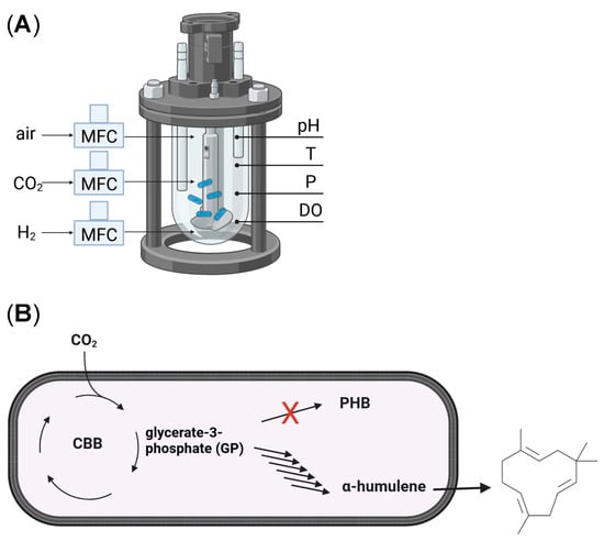 (A) Overview of the controlled bioreactor (MFC = mass flow controller, DO = dissolved oxygen, for a detailed description refer to the Materials and Methods section). (B) Schematic production of α-humulene forms CO2 in C. necator (CO2 is assimilated via the Calvin–Benson–Bassham (CBB) cycle, which yields 1 molecule glycerate-3-phosphate (GP) per 3 molecules CO2 fixed. Carbon can be stored in polyhydroxybutyrate (PHB) or used for α-humulene production starting from the same precursor acetoacetyl-CoA via the engineered mevalonate pathway (MVA) pathway or from glyceraldehyde-3-phosphate and pyruvate via the native methylerythritol 4-phosphate pathway (MEP). Here, a PHB-negative strain was used. The produced α-humulene was excreted in the media and afterward extracted by ISPR (in situ product removal).