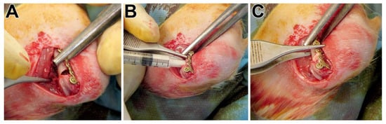 (A) Empty defect showing the critical-sized defect; (B) injection of the pre-mixed paste (pS100) into the fracture gap using a syringe; (C) fracture gap filled with the paste.
