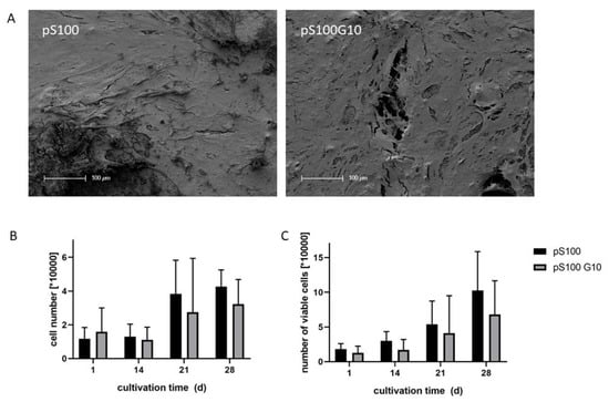Human pre-osteoblasts proliferated on both cement modifications. SEM investigation revealed a dense cell layer on both pS100 and pS100G10 after 21 days of cultivation (Figure 2A). DNA content of the samples increased during cultivation over 4 weeks (Figure 2B), without statistically significant differences between pS100 and pS100G10. The number of viable cells, analyzed by LDH activity measurement after cell lysis, also increased during cultivation, and no significant differences were shown between both groups (Figure 2C).