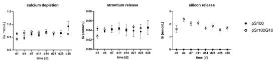 Quantification of calcium, strontium, and silicon in the supernatant of cement samples, which was incubated under cell culture conditions, showed a distinct calcium depletion by the samples of both the pS100 and the pS100G10 group. Though the Ca2+ concentration of non-treated cell culture medium was around 1.8 mM, its concentration decreased to around 0.5 mM after incubation in the presence of the cement samples (Figure 3A). The addition of MBG did not influence the release of strontium ions from the samples, which was in the same range for both modifications (Figure 3B). The pS100G10 MBG-containing samples showed a steady release of silicon over 4 weeks (Figure 3C).