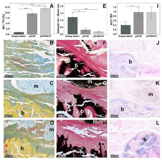 Histomorphometric analysis of bone volume over tissue volume (BV/TV), osteoid volume over tissue volume (OV/TV), and alkaline phosphatase activity over bone volume (ALP/BV) in the first panel ((A), * p = 0.03, *** p = 0.001; (E), * p = 0.009, ** p = 0.004; (I), * p = 0.03). Histomorphometric analyses reveal an increase in the bone formation in the pS100 and pS100G10 group, with simultaneous decrease in the osteoid volume. Pictorial representation of the tissue sections stained with Movat pentachrome (B–D) showing the maximum mineralized tissue (yellow) in the pS100 and pS100G10 groups, with von Kossa and van Gieson stains (F–H), and for alkaline phosphatase activity (J–L). (B,F,J) Empty defect; (C,G,K) pS100; (D,H,L) S100G10; m = material; b = bone.