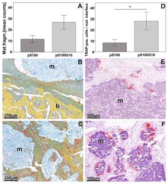 Increased material fragmentation was seen in pS100G10 compared to pS100 (p = 0.05) (Figure 5A–C). Comparing the number of TRAP-positive cells at the material interface, it was significantly higher in the pS100G10 compared to the pS100 group (p = 0.042) (Figure 5D–F).